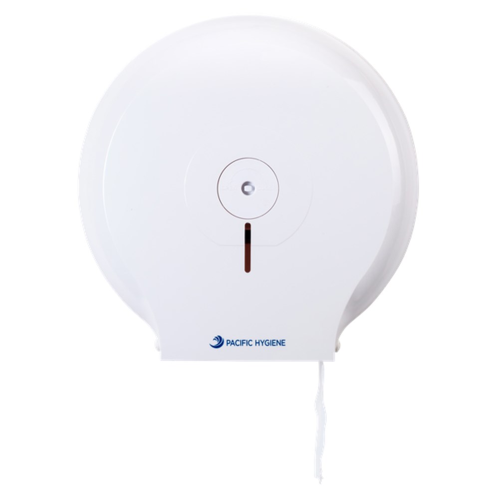 The Single Jumbo Dispenser in white is a durable and sturdy choice with a viewing window to reduce the risk of running out