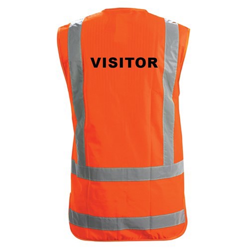 High visibility vest in fluorescent orange with an extra-long tail and additional reflective tape.